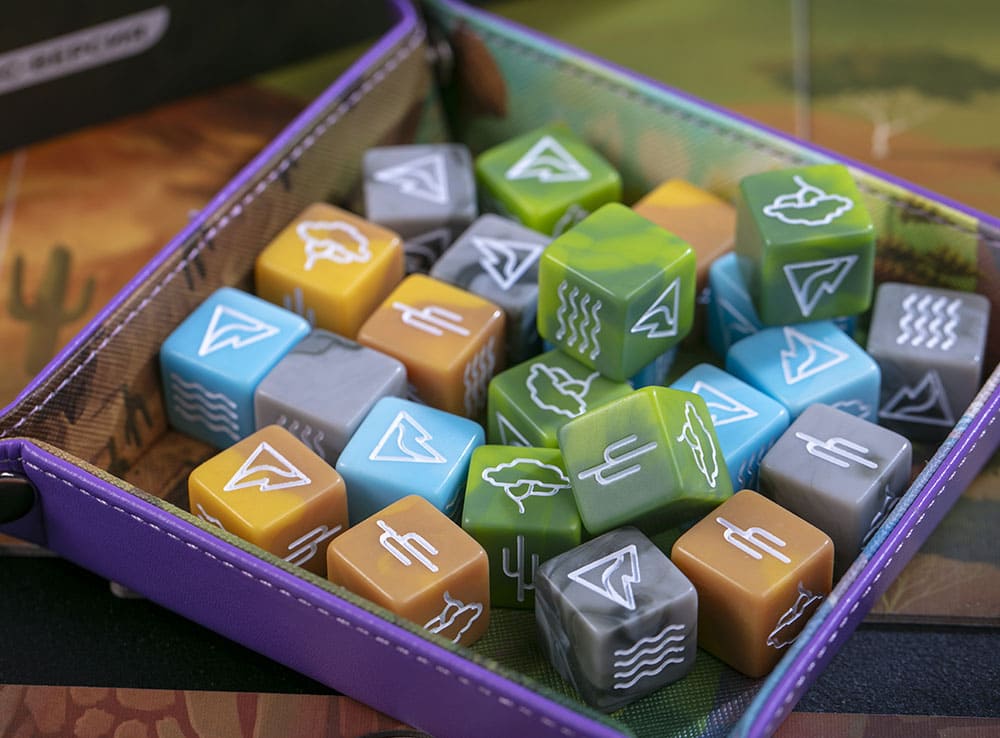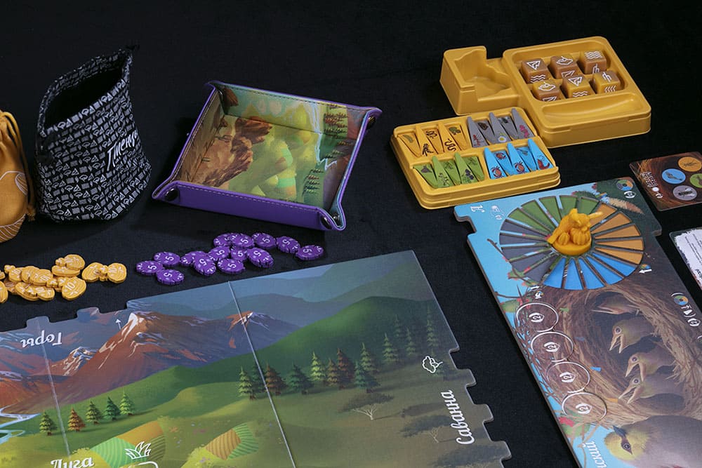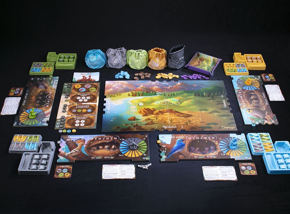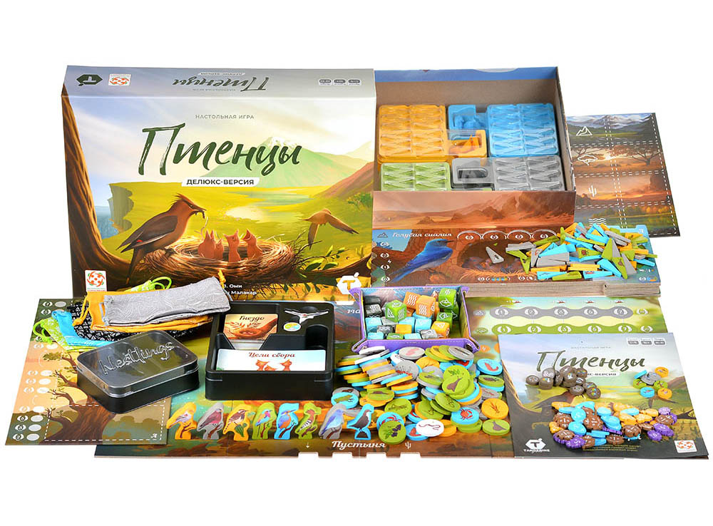 В состав настольной игры Птенцы. Делюкс входит: 4 планшета игроков, 4 3D-фигурки птиц, 24 кубика биомов, 80 сегментов биомов, 1 игровое поле, 1 поле соло-режима, 1 поле колод биомов, 1 поле целей сбора, 5 мешочков, 209 жетонов, 47 карточек, 4 справочные карточки, 1 маркер биомов, 6 органайзеров, 1 лоток (дайс-трей) для кубиков, правила игры.
