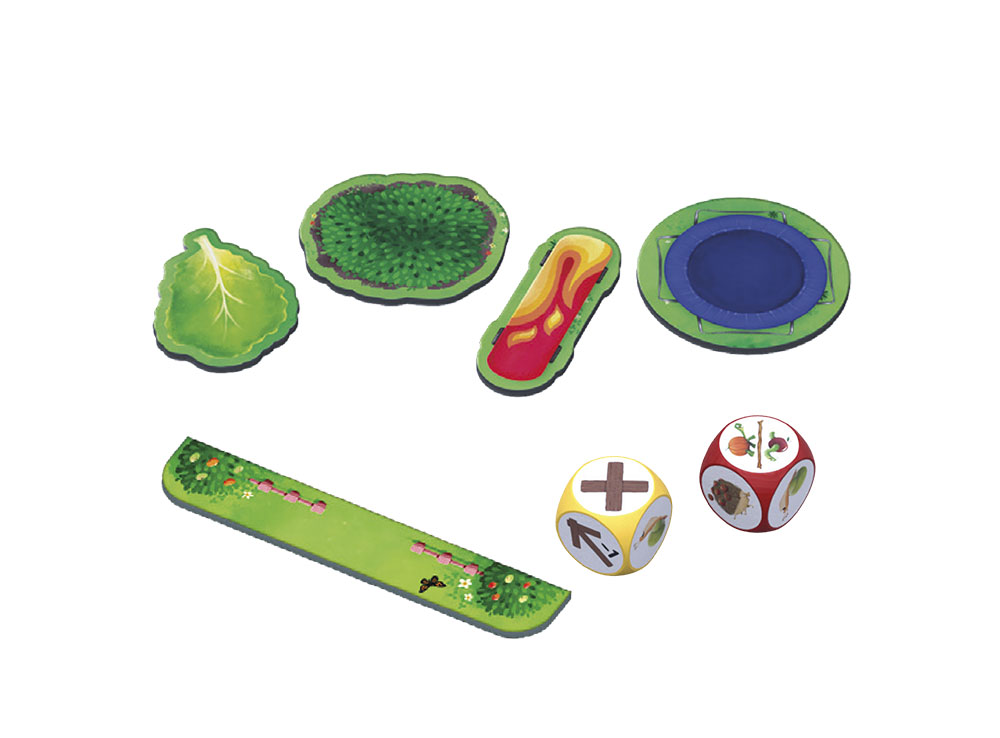В состав настольной игры Садовые гонки входят: 4 фишки животных, 4 карты животных, двухсторонний стартовый тайл, 7 двухсторонних тайлов сада, тайл калитки, 4 жетона предметов, 2 кубика, правила игры.