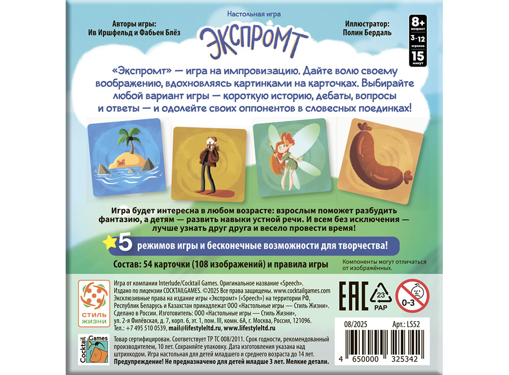 Экспромт – идеальный способ узнать, кто из вас самый яркий и харизматичный оратор. Здесь каждый участник вступает в захватывающие словесные состязания, вооружённый только воображением, артистизмом и своим умением создавать интригу. Дайте волю своему воображению, используя только карточки с картинками. Вы можете выбрать любой из нескольких вариантов игры: придумывать историю, вести дебаты, отвечать на вопросы, ... Игра будет интересна всем возрастам: у взрослых поможет разбудить фантазию, детям – развить навыки устной речи. А всем игрокам без исключения – лучше узнать друг друга и весело провести время!