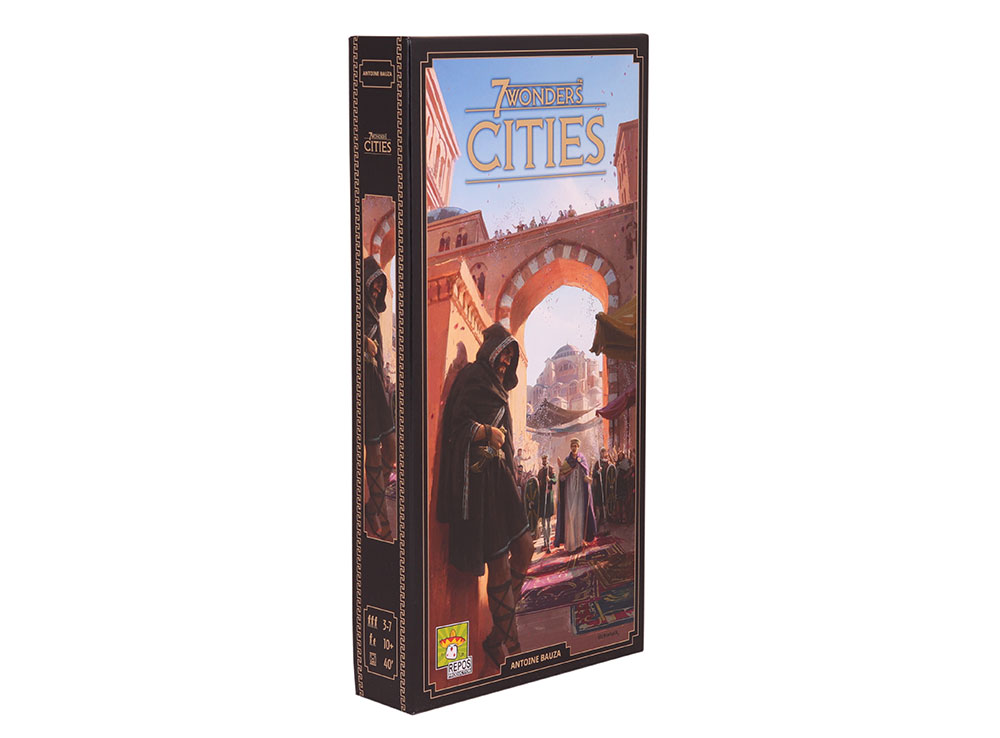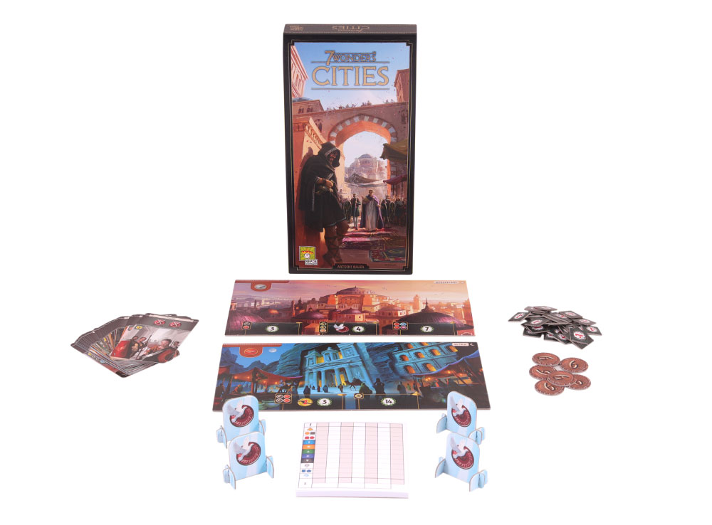 Долги, грабёж, дипломатия... Это дополнение к игре «7 Чудес» позволит вам взглянуть на великие города античности с другой стороны. 42 карты Эпох вместе с 2 новыми полями Чуда Света привнесут в игру никогда раньше не виданные эффекты. Дополнение «Города» вводят новые правила в базовую игру «7 Чудес», но условия победы остаются без изменений. Это дополнение также предлагает вариант для игр в командах (с 4 или 6 игроками). Оно полностью совместимо со 2-м изданием 7 чудес (7 Wonders), в нём убраны карты лидеров и карты гильдий. Добавлены 15 карт с новыми эффектами, монеты достоинством «6», жетоны дипломатии получили подставки для вертикального размещения на планшете.