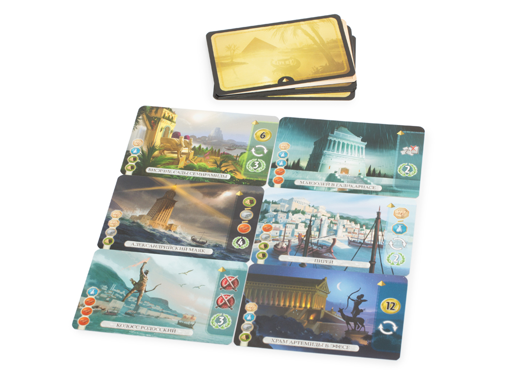 Внутри вас ожидает совершенно новая система выбора карт, 3 разных способа одержать победу, включая научное и военное превосходство, а также 12 чудес света, с которыми каждая последующая игра будет интереснее предыдущей!