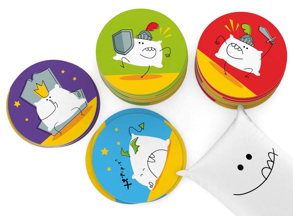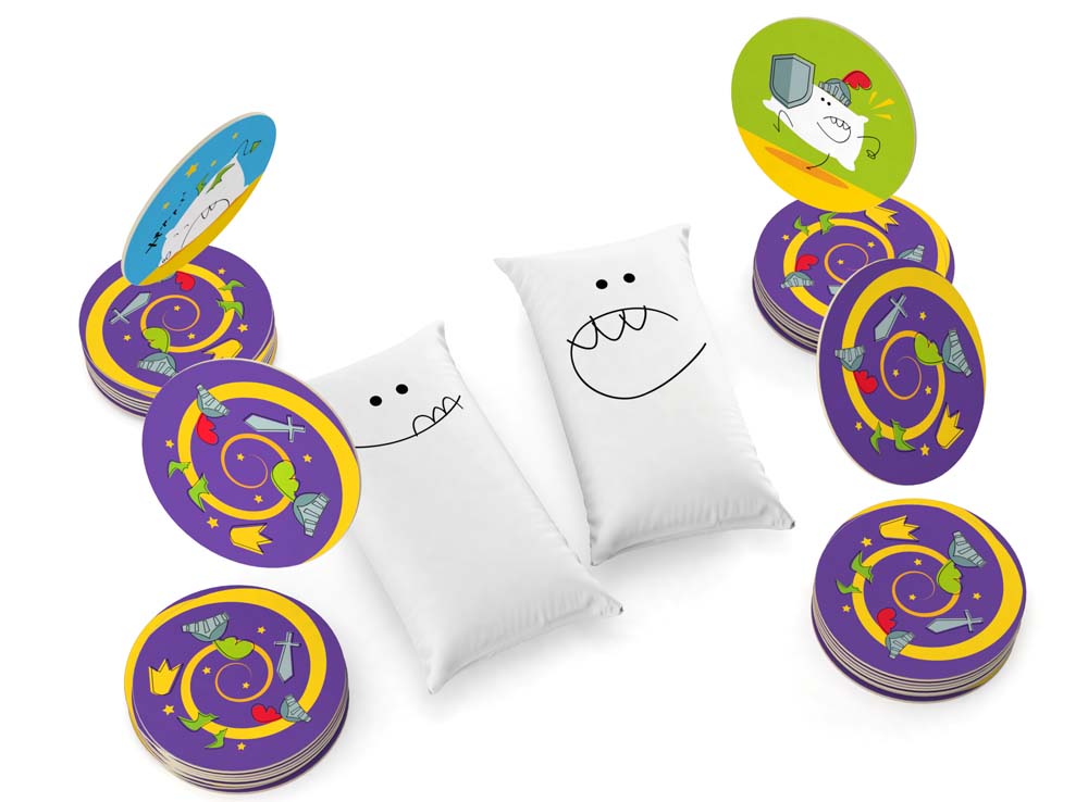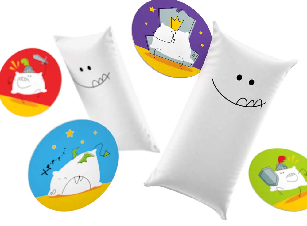 В состав настольной игры «Битва подушками» входит: 2 мини-подушки, 56 карточек персонажей, правила игры.