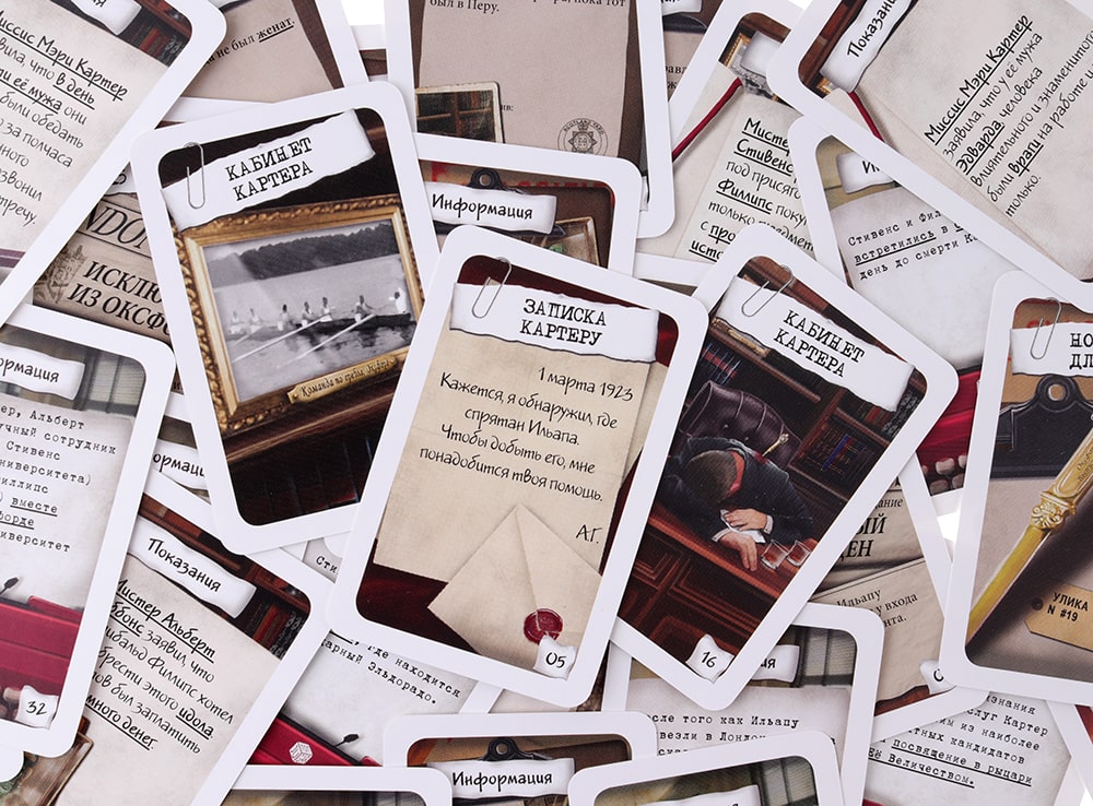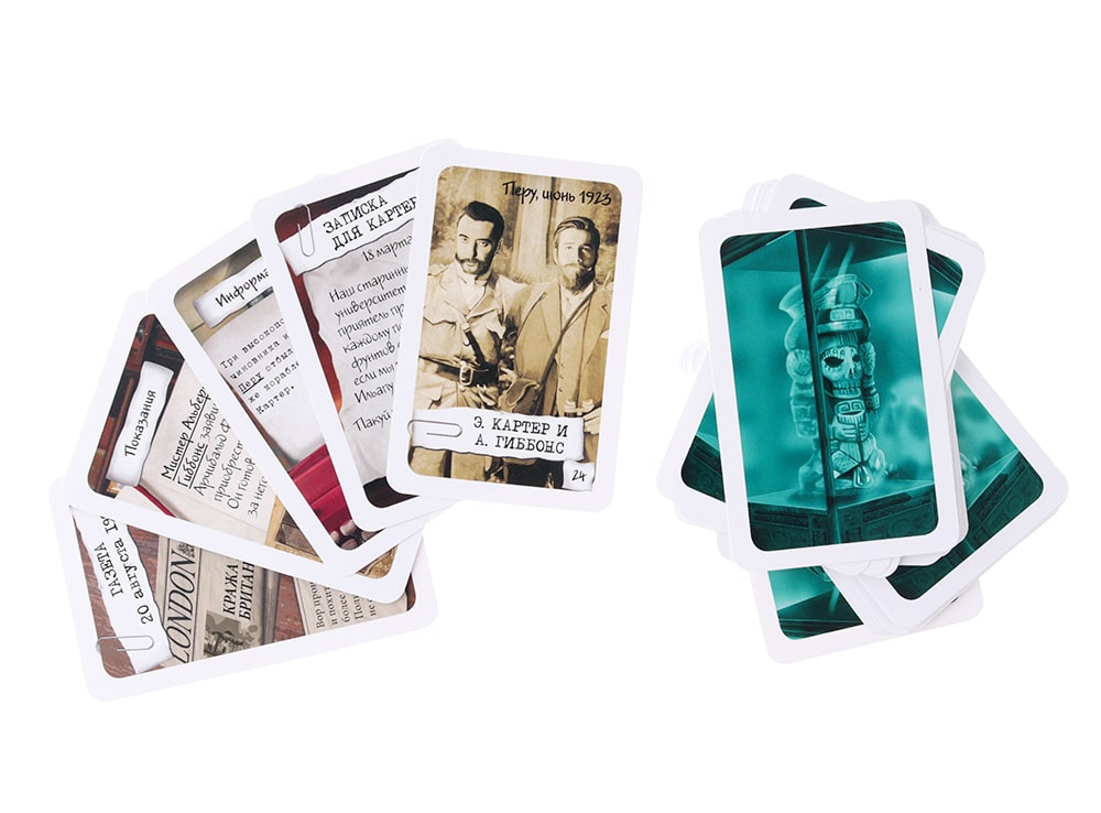 В состав настольной игры Элементарно! Смерть археолога входят 37 карт и правила игры.
