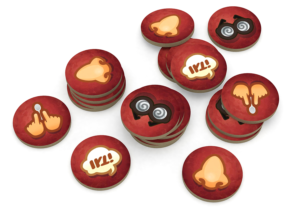 В состав настольной игры Голодные ведьмочки входят: 1 котёл, 2 волшебные ложки, 28 жетонов соли, 20 жетонов бородавок, 4 планшета ведьмочек, 68 карточек еды, 3 карточки свечей, 2 пары игровых очков, правила игры.
