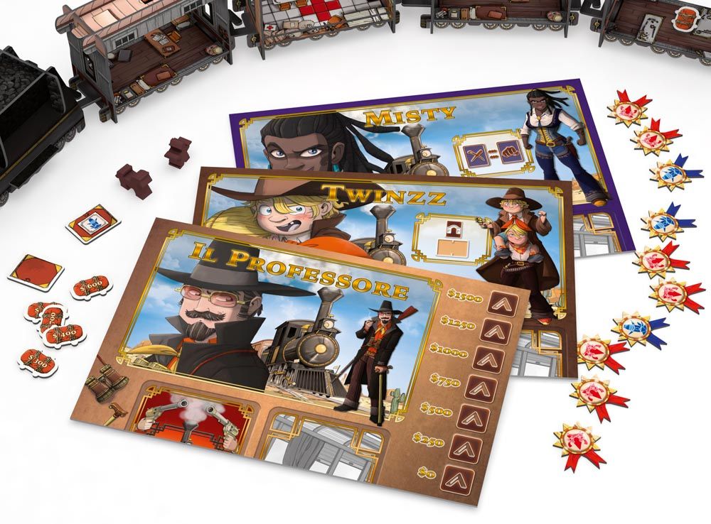 В состав дополнения Курьеры и бронепоезд входят: 1 бронированный поезд (7 вагонов); 2 жетона пулемётов; 30 карточек; 14 жетонов добычи; 10 значков команды; 1 жетон «Дикая банда»; набор компонентов для 2 новых персонажей; набор компонентов для Иль Профессоре; правила игры.