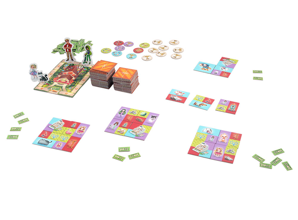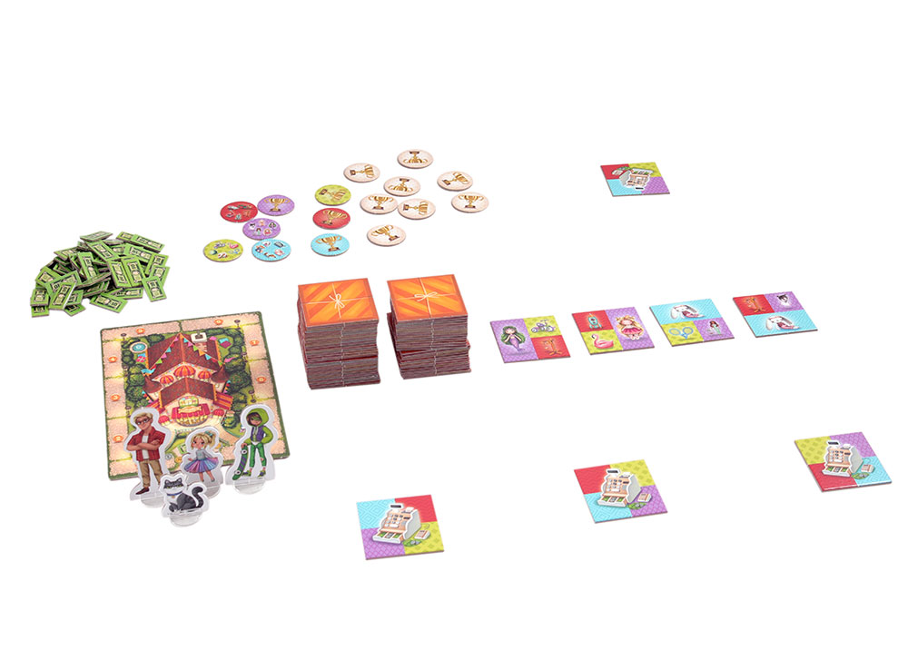 В состав настольной игры «Мой магазин игрушек» входят: 64 карточки с игрушками; 4 стартовые карточки с кассой; 45 жетонов денег номиналом 10 монет; 16 жетонов наград: 4 награды за разнообразие игрушек; 4 награды за большинство одинаковых игрушек; 8 запасных наград; 7 фишек игроков; 7 пластиковых подставок для фишек; 1 счётчик монет; правила игры;