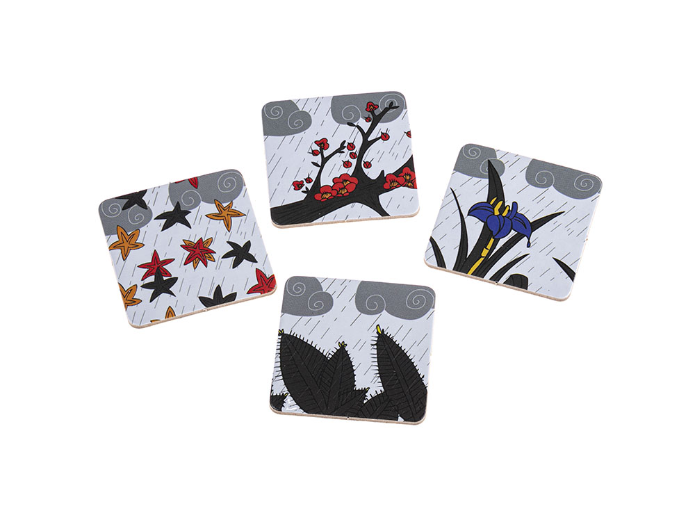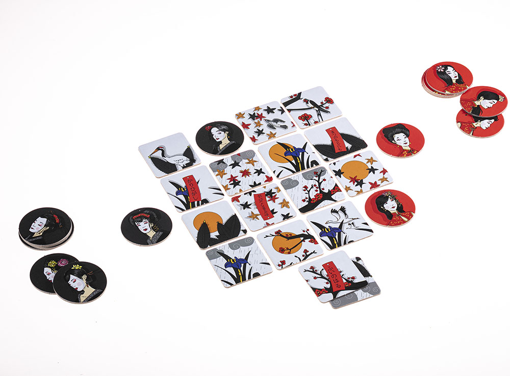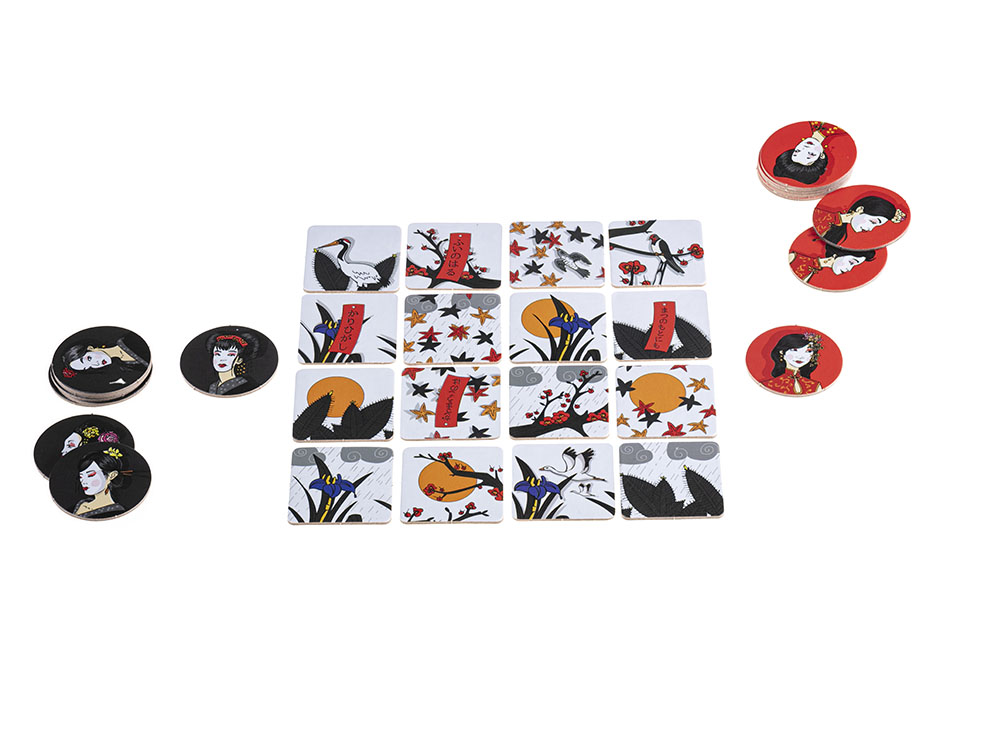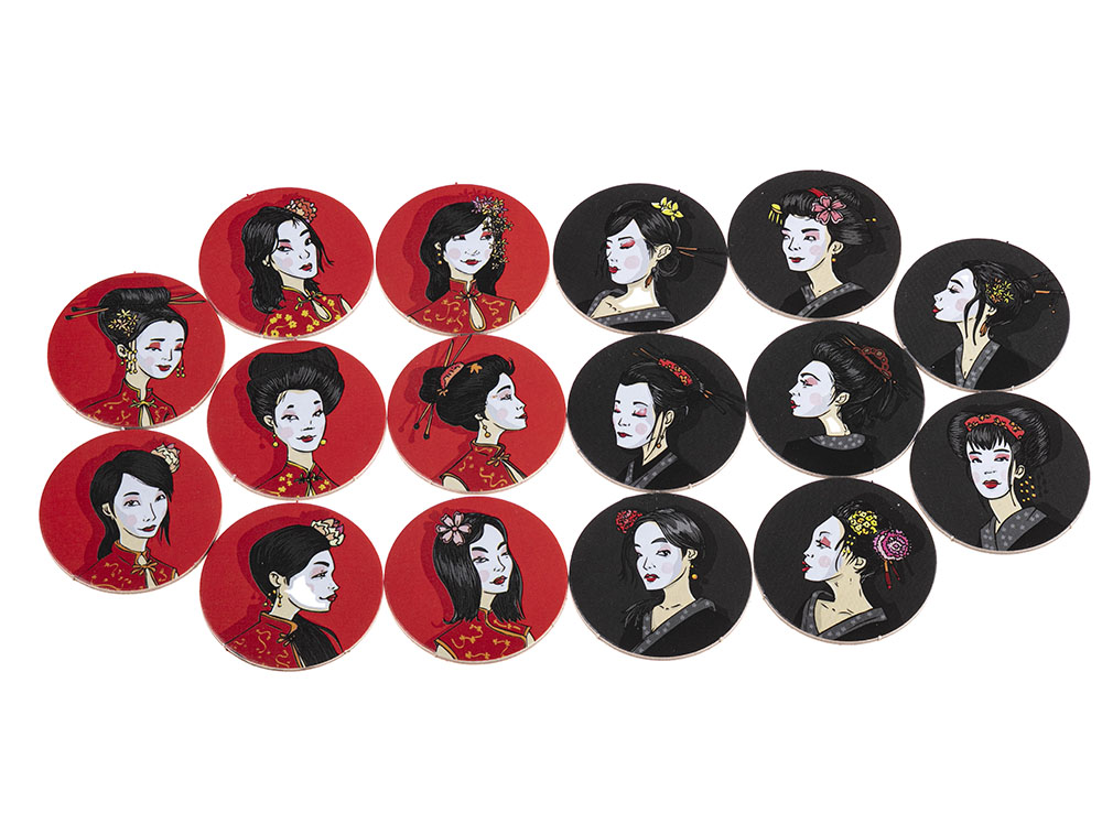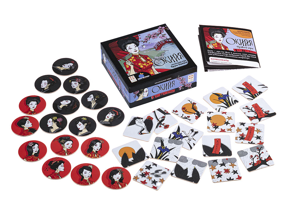 В состав настольной игры Окийя входят: 8 красных жетонов гейш, 8 чёрных жетонов гейш, 16 карточек императорского сада, правила игры на русском языке.