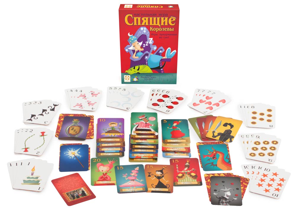 В состав настольной игры Спящие королевы входят: 79 карточек (12 карт королев, 8 королей, 5 шутов, 4 рыцаря, 4 сонных зелья, 3 волшебные палочки, 3 дракона, 40 карточек с цифрами от 1 до 10). Правила игры на русском языке можно скачать на нашем сайте.