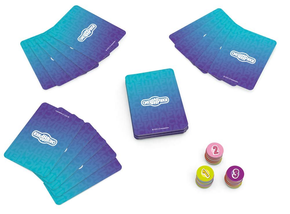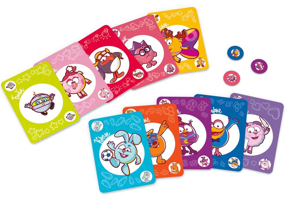 10 наборов по 4 карточки в каждом (Крош, Нюша, Ёжик, Пин, Лосяш, Бараш, Копатыч, Совунья, Кар-Карыч, Биби), 30 жетонов Смешариков (по 10 жетонов для каждого раунда), правила игры.