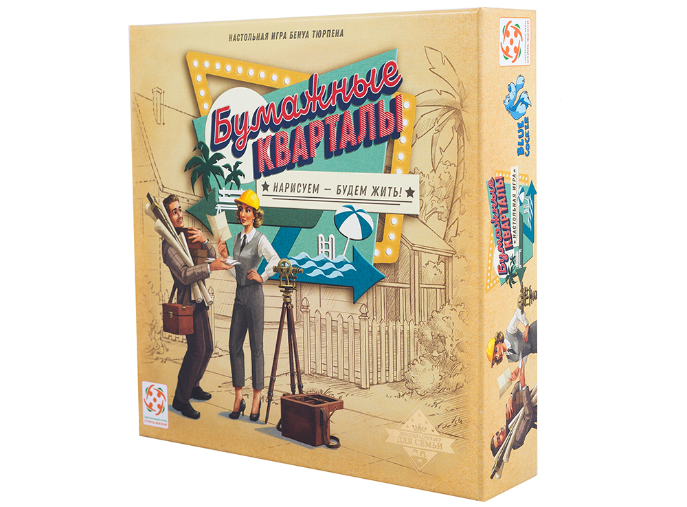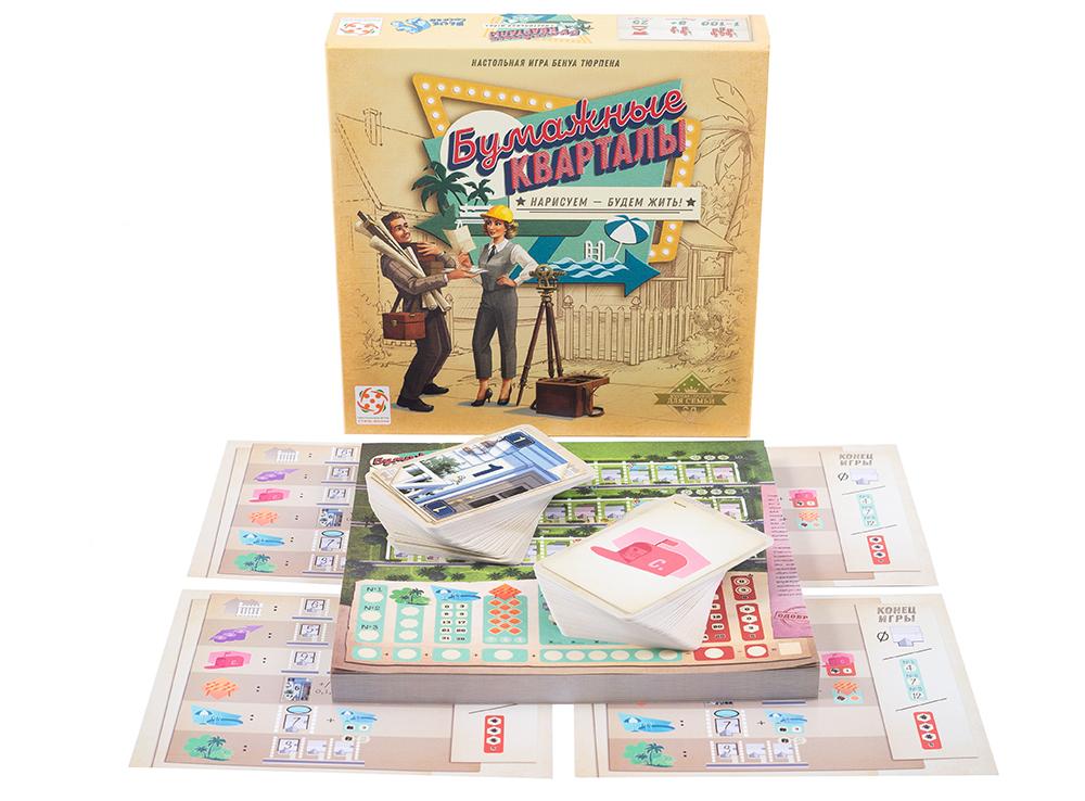 В состав настольной игры Бумажные кварталы входят: 29 двусторонних карточек планов застройки, 81 двусторонняя карточка строительства, 4 памятки, блок из 100 полей для строительства кварталов и подсчёта очков, правила игры.