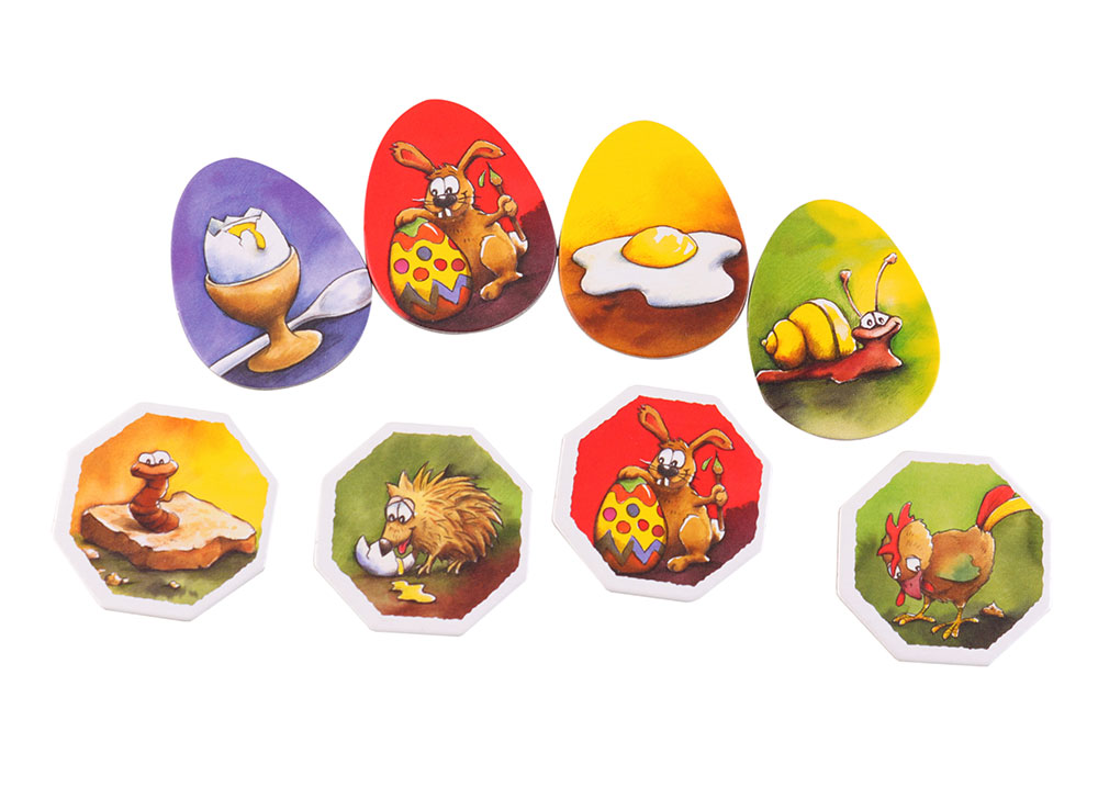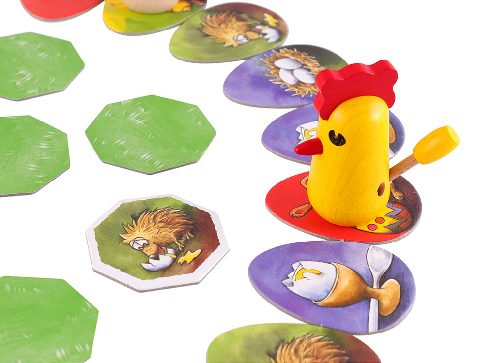 В состав настольной игры Цыплячьи бега входит: беговая дорожка: карточки в форме яиц – 24 шт, птичий двор: восьмиугольные карточки – 12 шт, цыплята – 4 (два петушка и две курицы), хвостовые перья – 4 шт (по одному для каждого цыпленка).